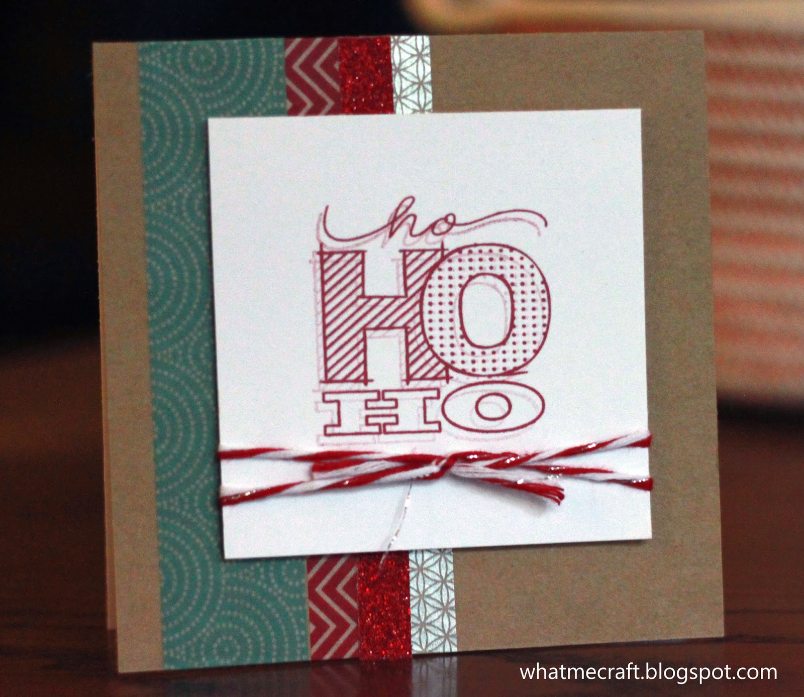 If you like simple- this is the card for you! The Santa's Greeting stamp set is only $2.95! And the background paper is simply washi tape and shimmer trim. The card is 4- 1/4 x 4- 1/4 which is perfect for putting on a present or in a stocking.